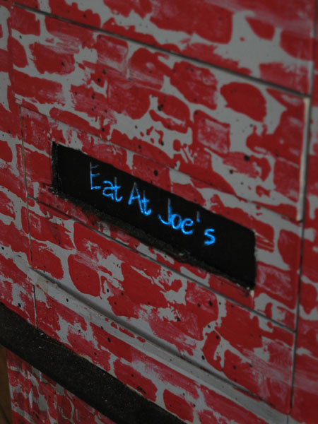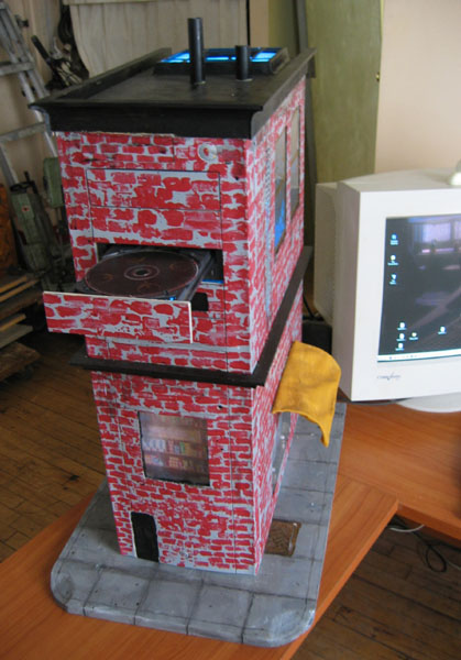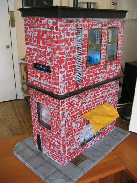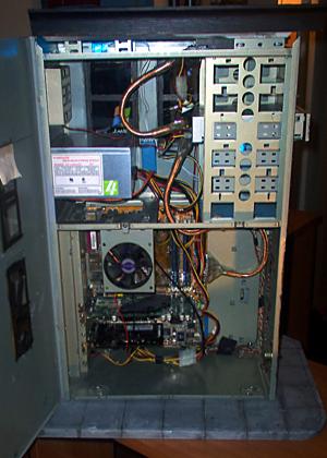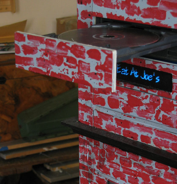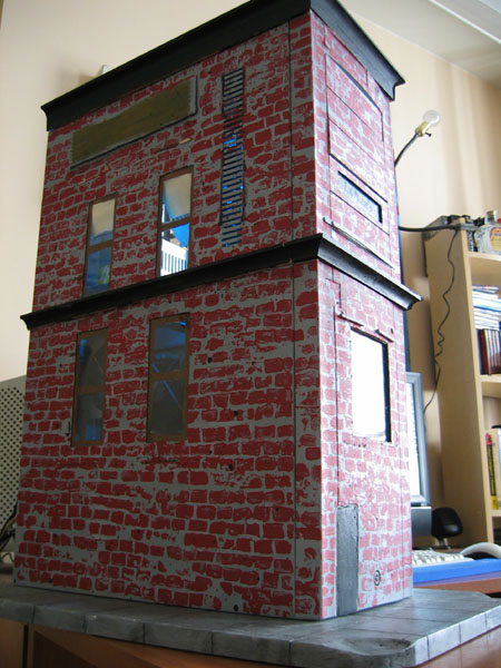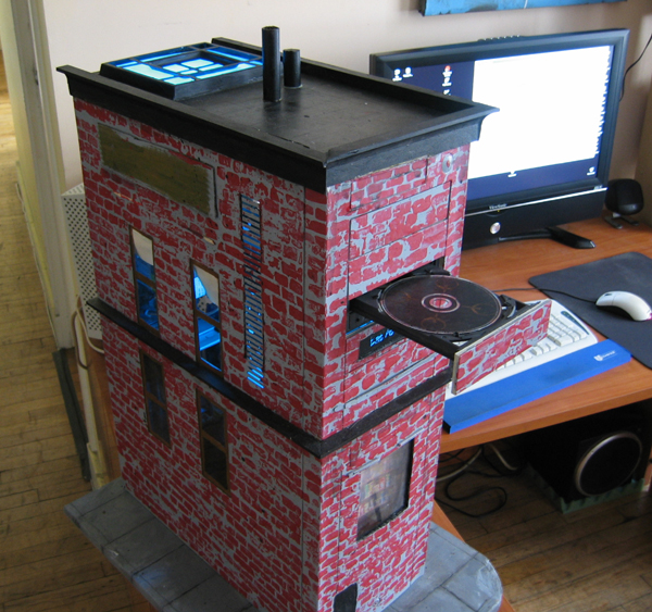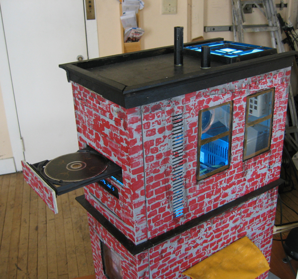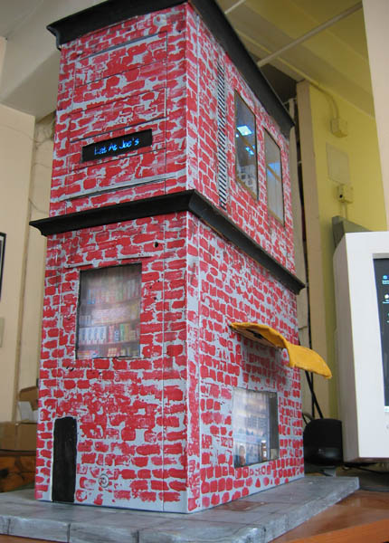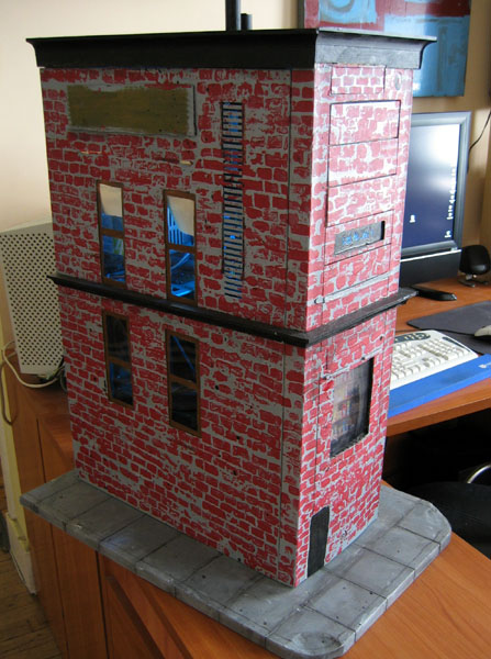 | This project was conceived from paintings that I do, comprised of cityscapes. I had an old SuperMicro server case lying around, and its shape suggested a building. The bulk of the work was in the cutting of the windows, using a dremel tool and spending hours hunched over the side panels, worrying if I was cutting straight. Once I finished, I has scrounging around for some 16th' acrylic and came across a vacuformed plastic part that suggested a skylight, so once again I found myself hunched over, this time cutting the roof. Once the pieces started coming together, I realized that the building part looked ok, but was lacking a reference point. I decided to include a sidewalk and cut a piece of plywood for the base, once again using the dreaded dremel, this time, etching sidewalk grooves into the wood. After putting the pieces together, it still seemed to lack something, so in an effort to glean ideas, I hit the pavement, staring up at ever building around me- aha! There it was, edging! I ran to the hardware store, found several pieces of corner molding that fit perfectly- the case was complete. In order to give it a brick texture, I made a stamp out of one of my left over window cutouts, gluing small rectangles of thin foam to it, to approximate a brick pattern and using a thin acrylic paint, stamped out the bricks. Finally, after installing lights, the last bit of inspiration was a neon sign, made by etching a piece of acrylic and gluing it into a computer blanking plate. |