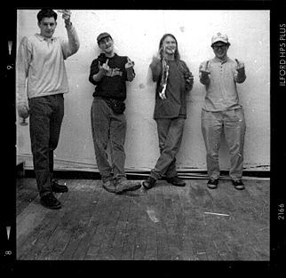 | Three weeks prior, during the unseasonably warm winter break, Smoothie came back from his five month trek across the country. "Un- fuckin'-believable," he'd said, "the ability to go from one side of the country to the other without paying a dime, me and Samvino would go into Safeway and just cram everything down our mouths, like we'd get sandwiches and stuff from the deli counter and then go to some aisle with nuthin' in it and chow." Since his precipitous arrival he had done nothing but drink beers, tell stories of the road and scam on females, none of which had any credibility or common sense, for that matter. "It was like this, me an' Sammy we're all coked up, following this car fulla girls met at this bar & we're goin' back to their place to party. So we're drivin' and stoked, talkin' about how cool the situation is, how we're gonna get laid, and not paying attention to the road. Well, what we didn't notice was that the car we're following, stopped at a light. So me an' Samvino are just so into the conversation that we paused for a sec, only to realize that neither of us is watchin' the road. We look up. Scream. I'm slammin' on the brakes, we're not gonna make it, I get right up behind car and swerve into the right lane, which was empty, thank Gawd, Goodyear rubber scorching alla' way, and stop... right next to car of girls, who're wavin' and carrying on with the radio blasting, no idea how close to death they had come.” |